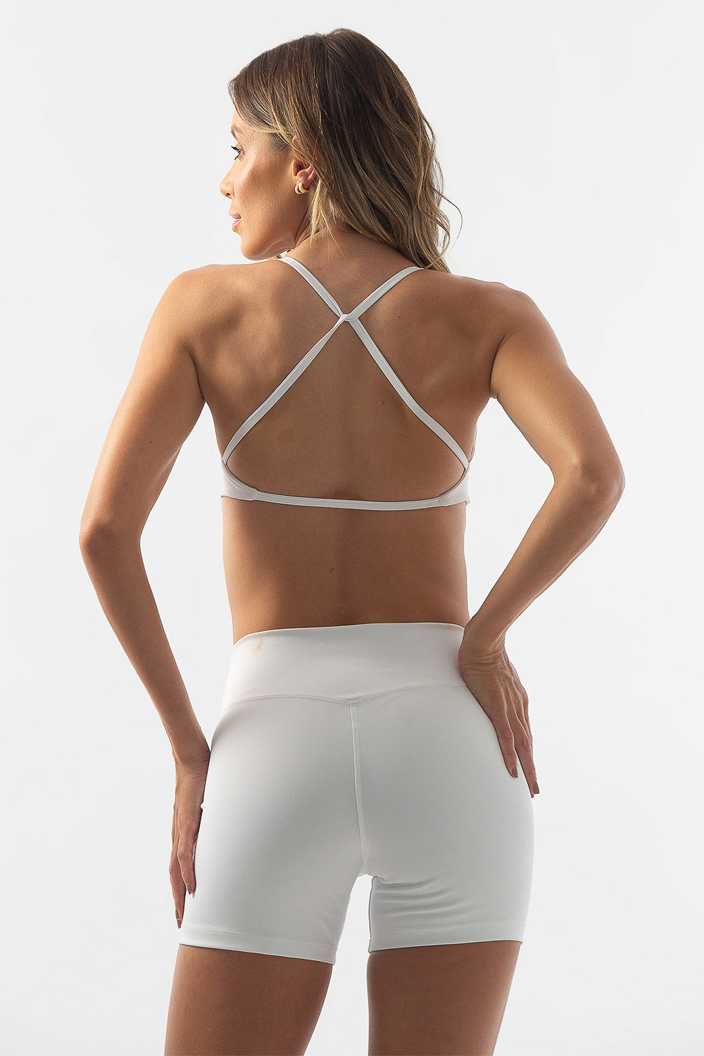 Sua modelagem foi pensada para unir leveza e suporte com um visual moderno. As alças finas transpassadas nas costas valorizam a região da escápula e garantem liberdade total de movimento, sem abrir mão da firmeza.