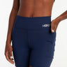 O cós médio de 9 cm sustenta sem apertar. Os bolsos laterais, profundos (21 x 9 cm), guardam celular, chaves ou géis energéticos sem balançar. E o ajuste pensado para diferentes biotipos garante que o tecido não enrole, mesmo em treinos longos ou para quem tem coxas mais fortes.